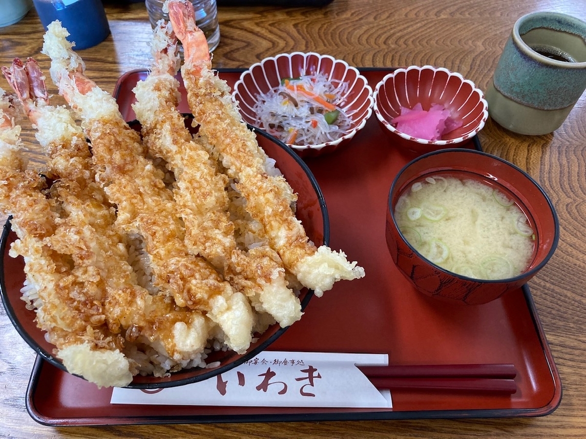 久しぶりに「赤字丼」を食べに行った。海老5本がのった海老天丼。1,650円かな。長沼町のいわきさん。まずはみてよ、これ。